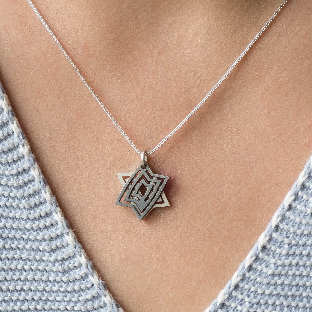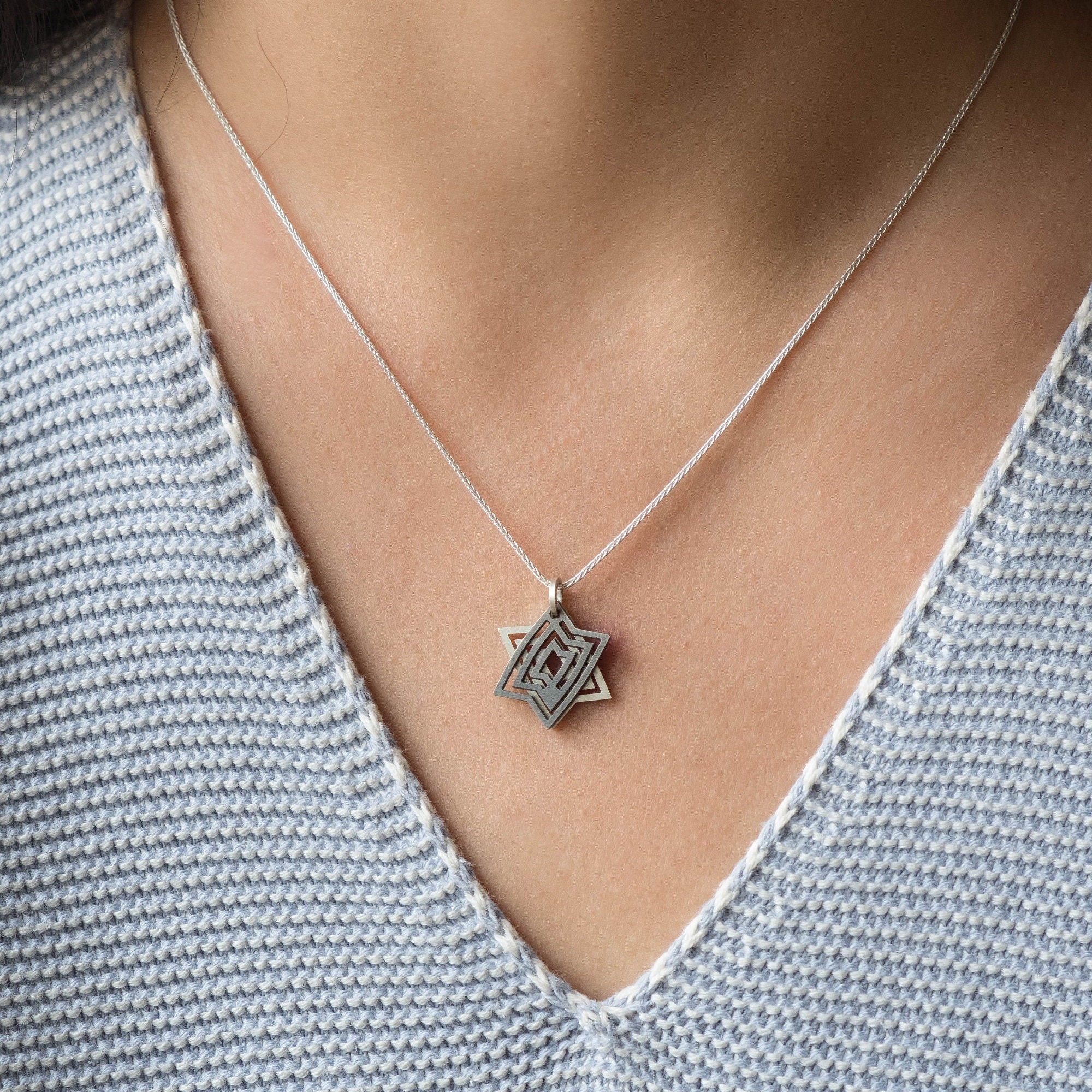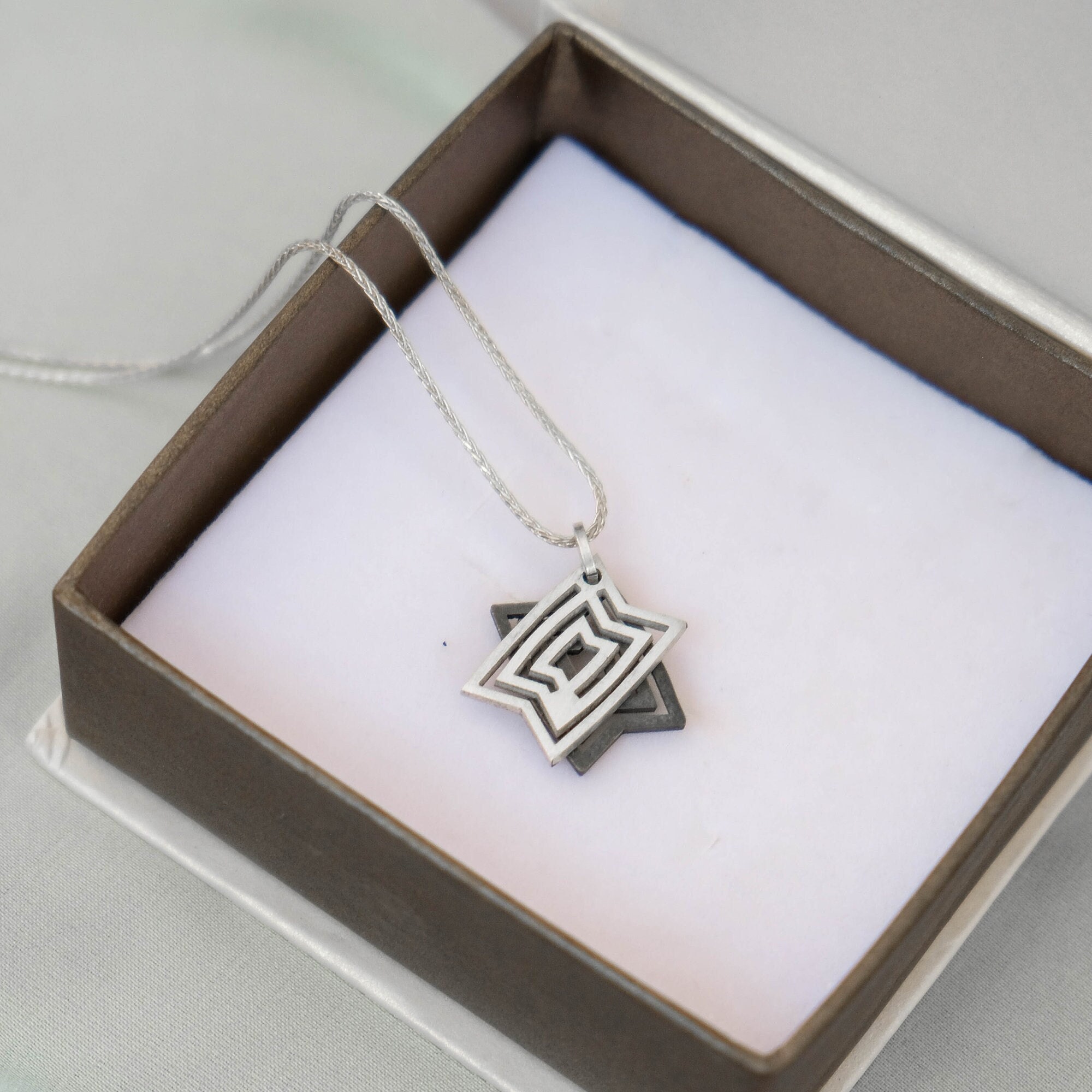 This store is so unique filled with stunning originality! Beautifully packaged in a quality box this necklace is positively gorgeous. A Star of David that isn’t when necessary, it is a rare style for those who prefer a more discreet look. I highly recommend this store and designer for something completely different and yet classic as well.