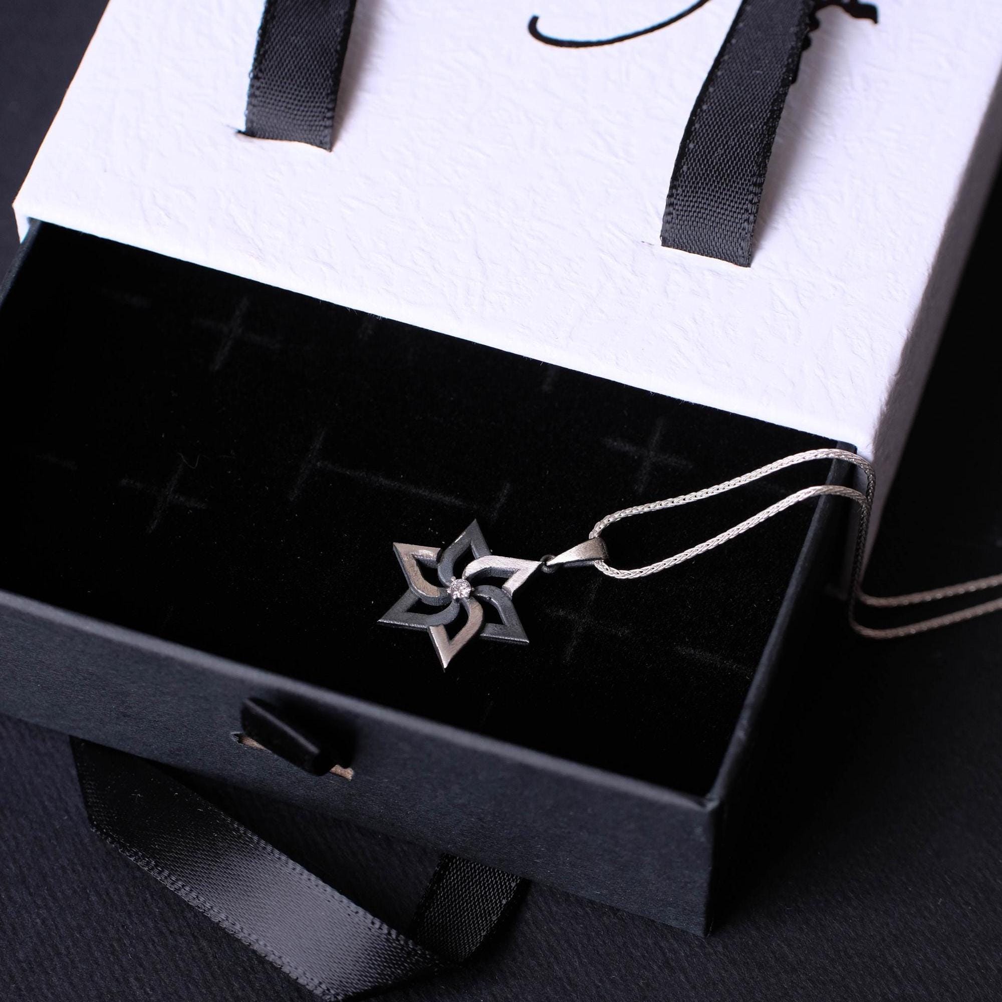 The pendant is crafted from solid sterling silver and finished with a dark patina, which beautifully enhances the contrast between the oxidized silver and the bright diamond.
