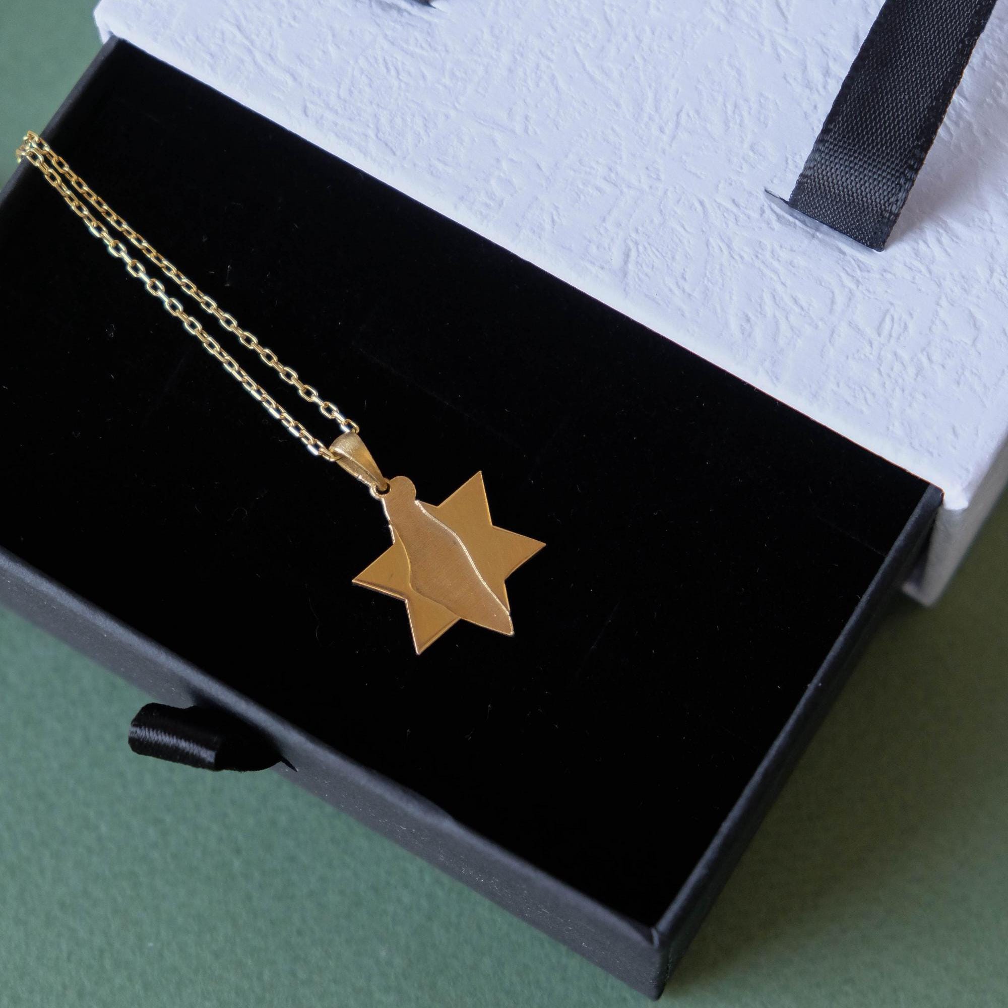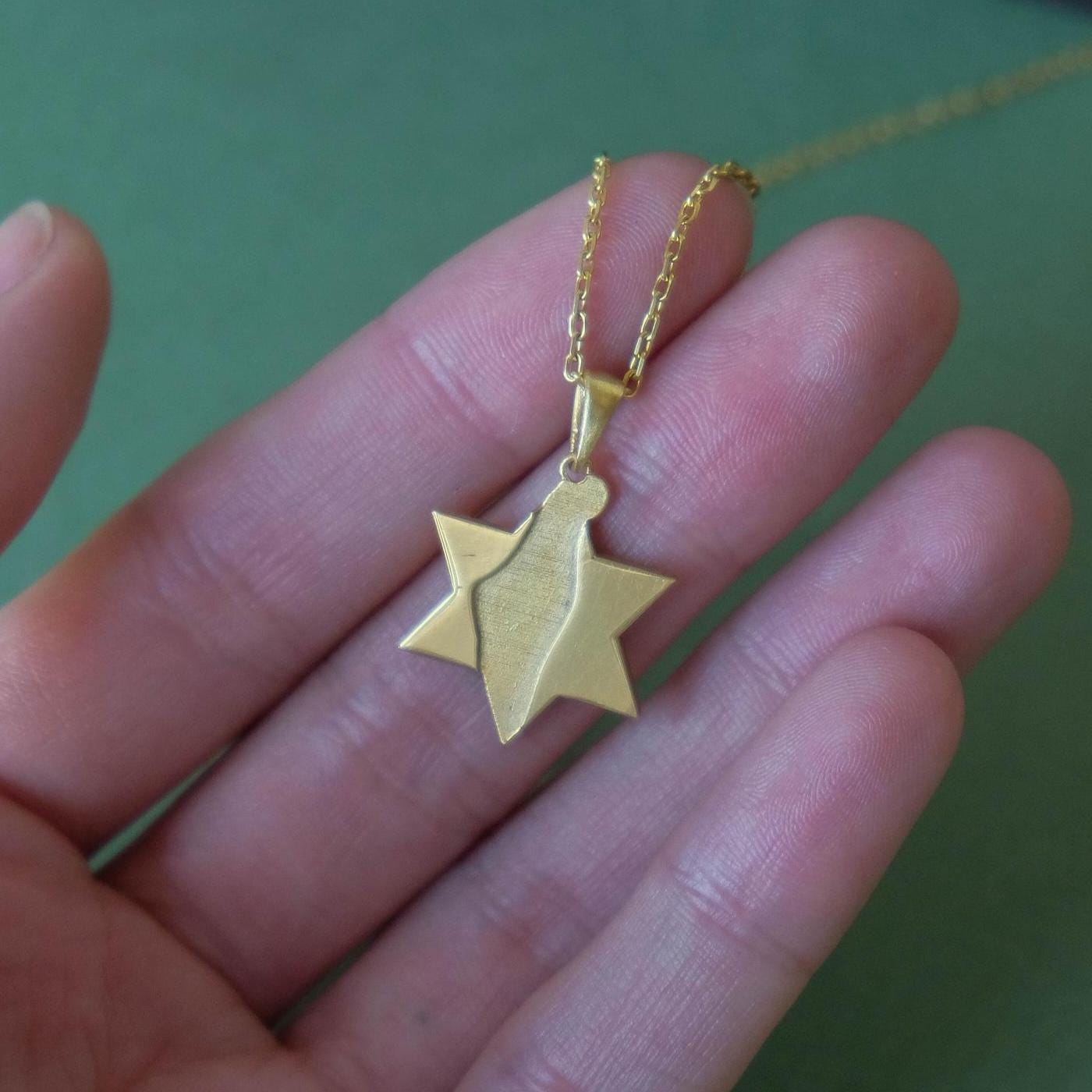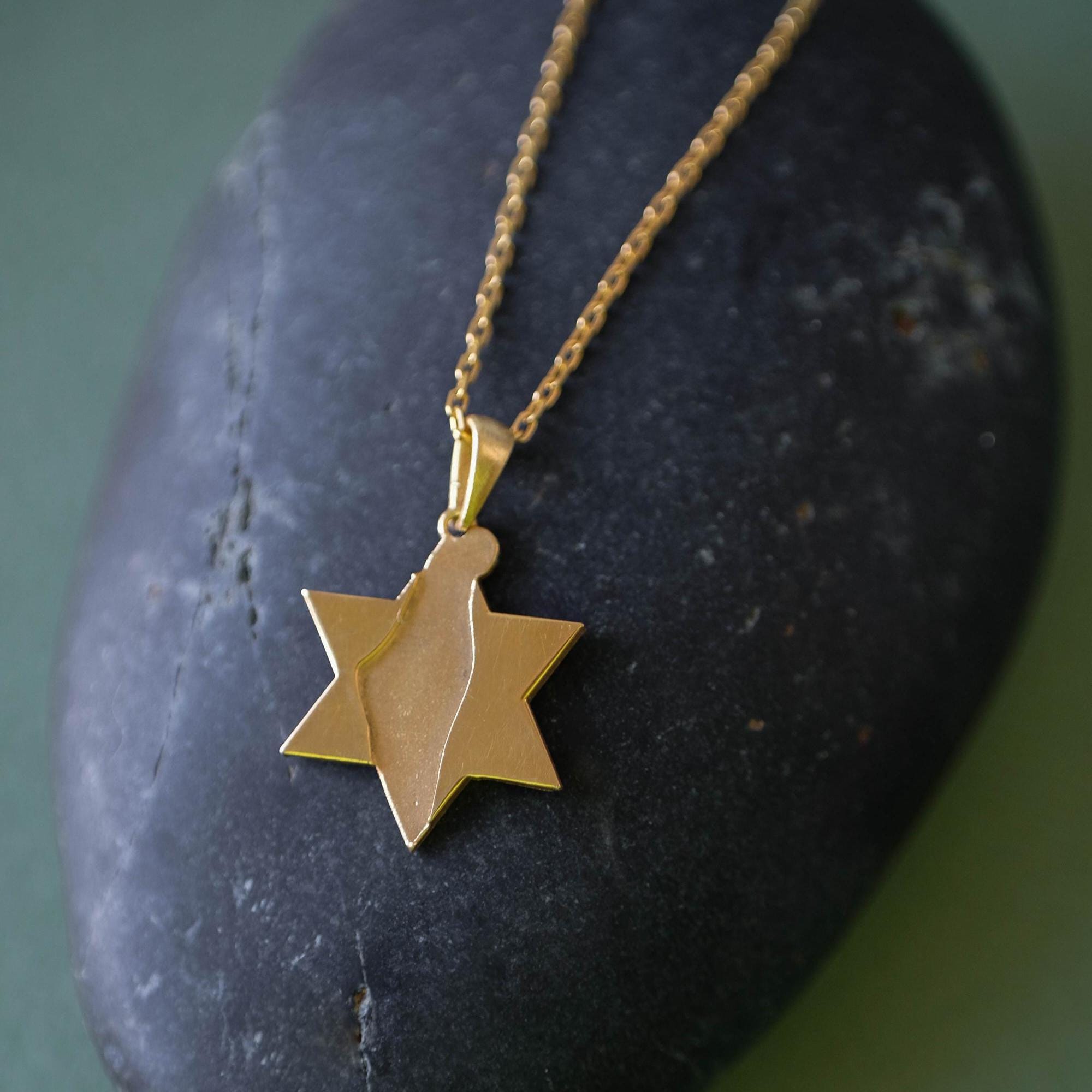 14K Yellow Gold Magendavid with Israel Map Pendant Jewish Gold Necklace Modern Judaica Gift