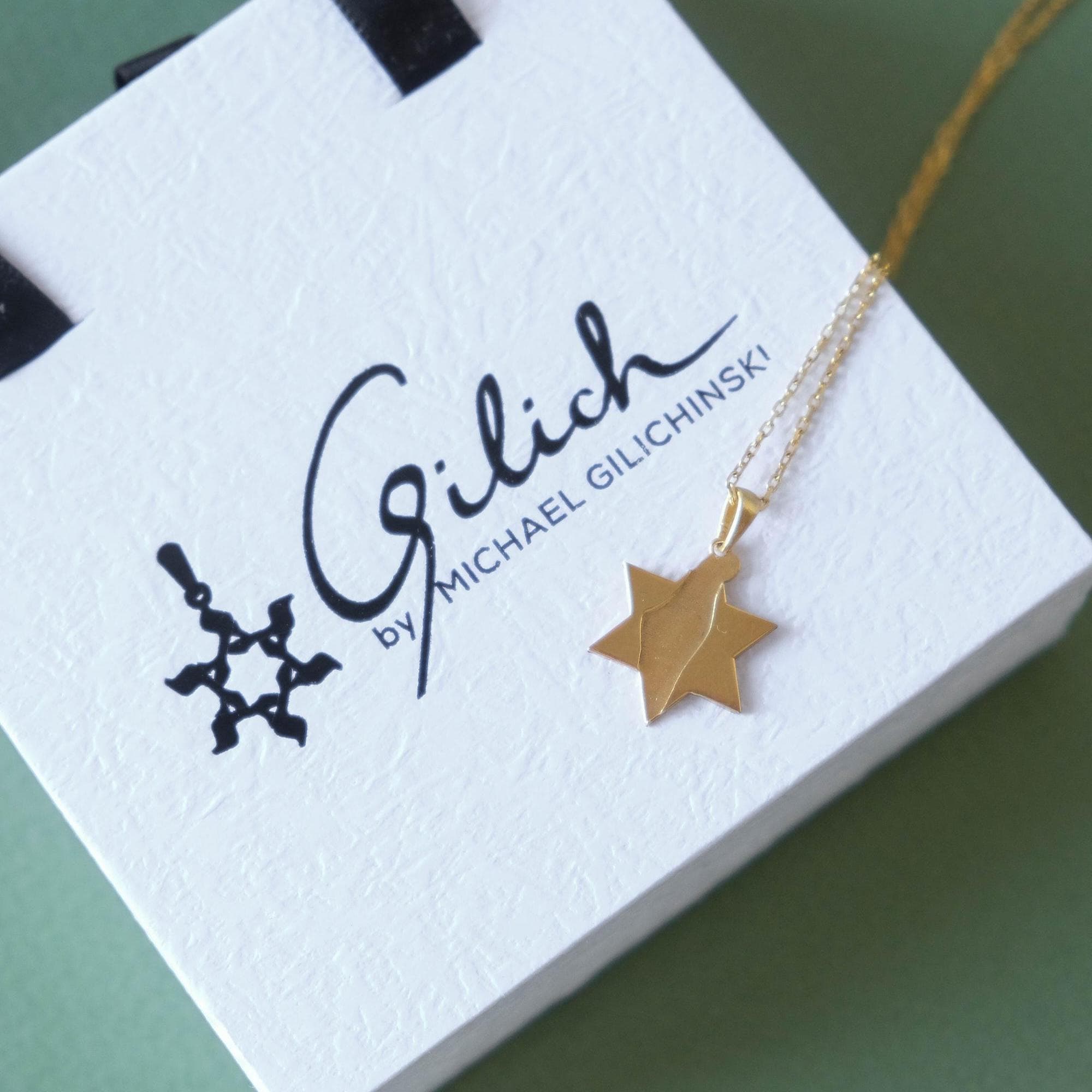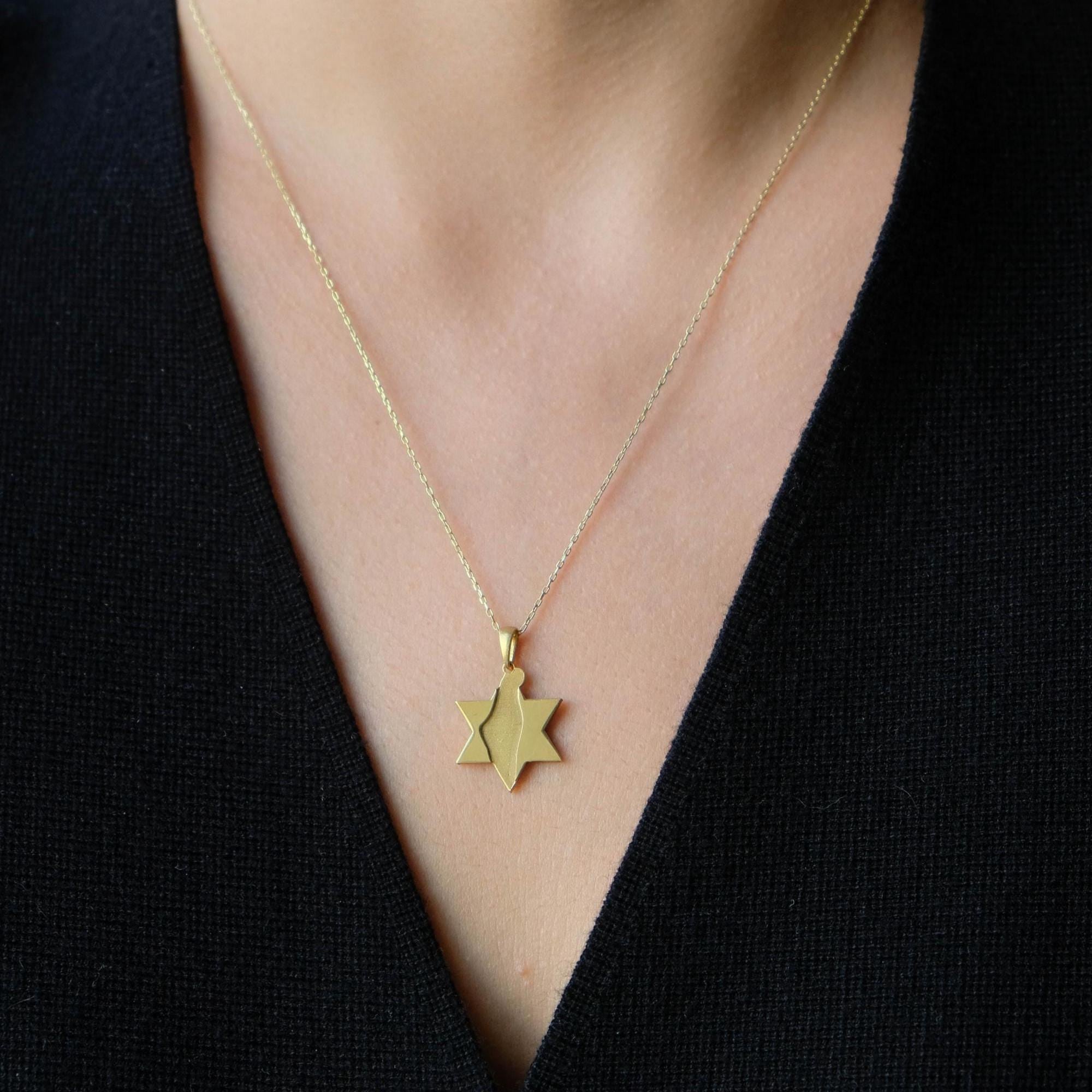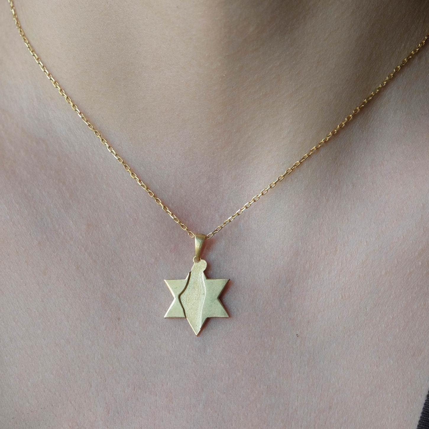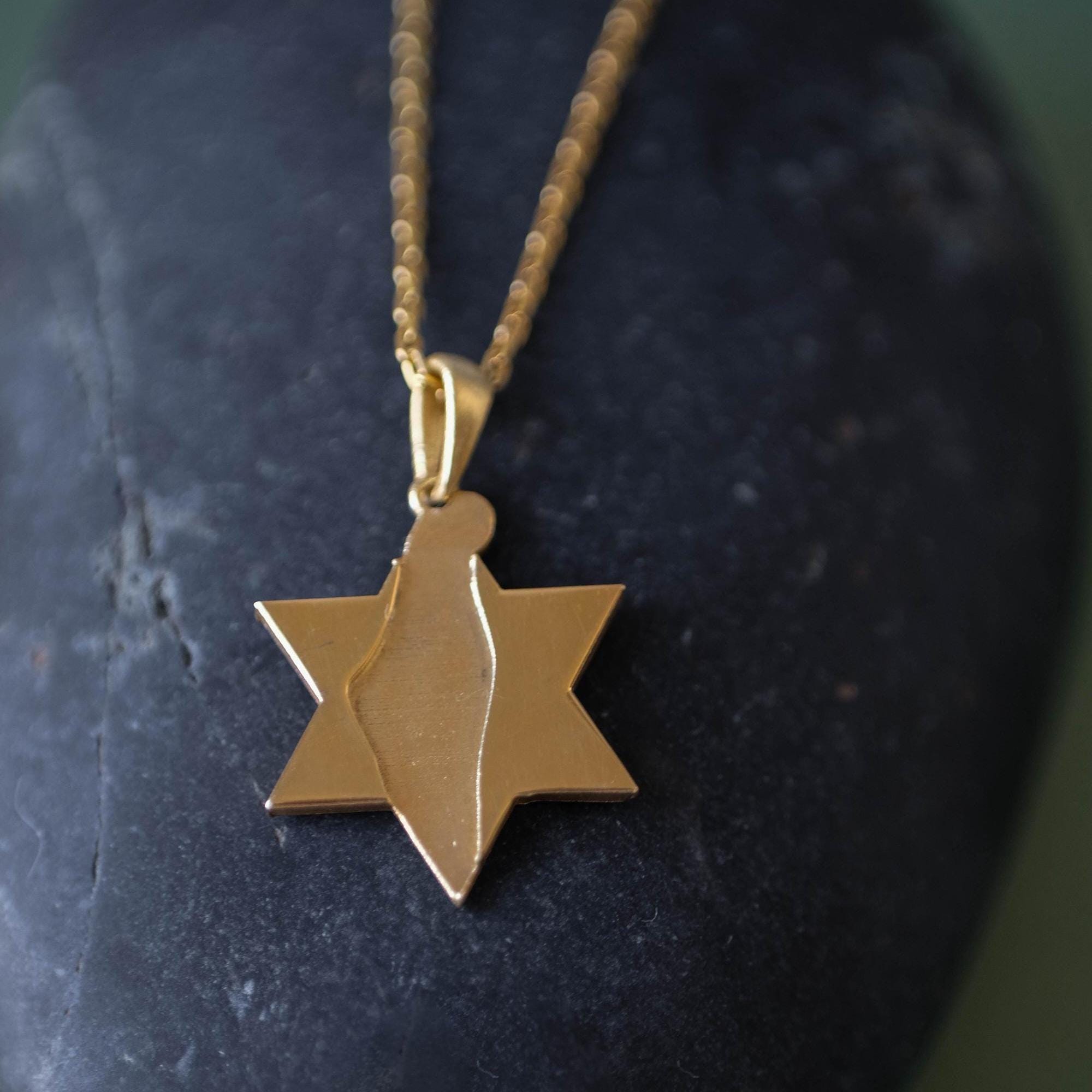 14K Yellow Gold Magendavid with Israel Map Pendant Jewish Gold Necklace Modern Judaica Gift