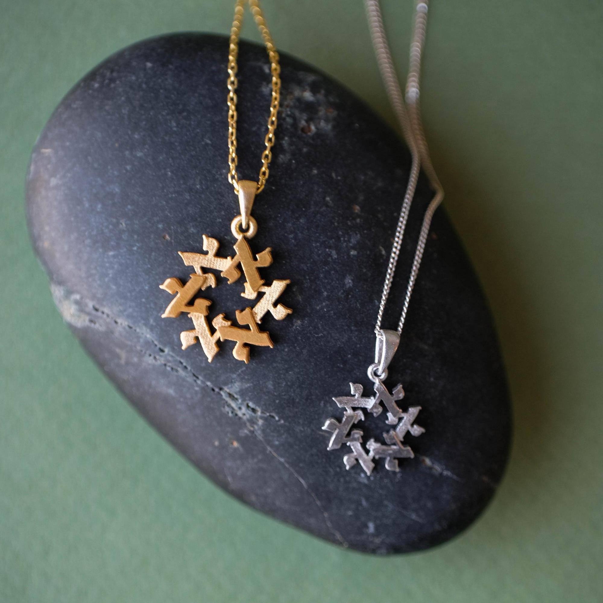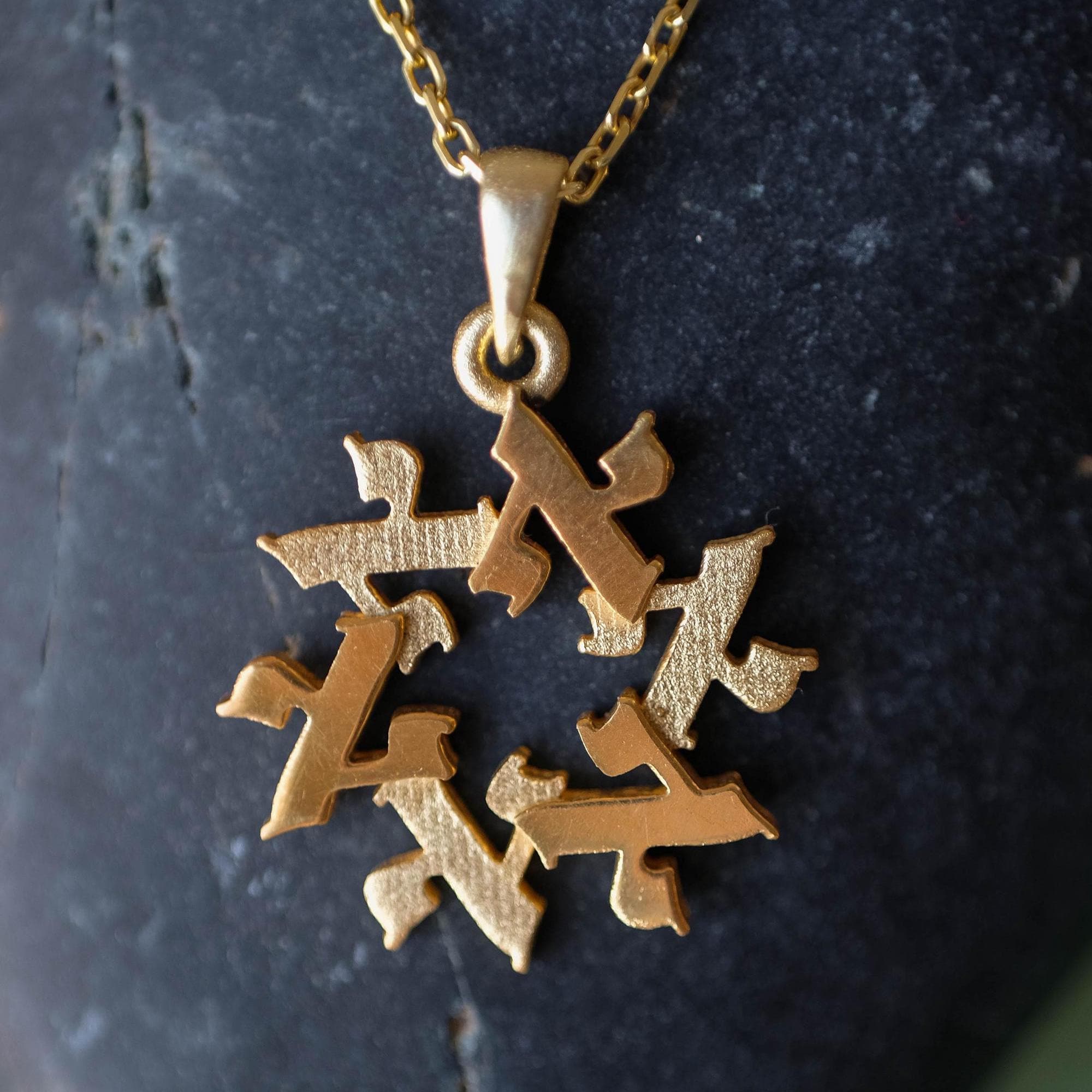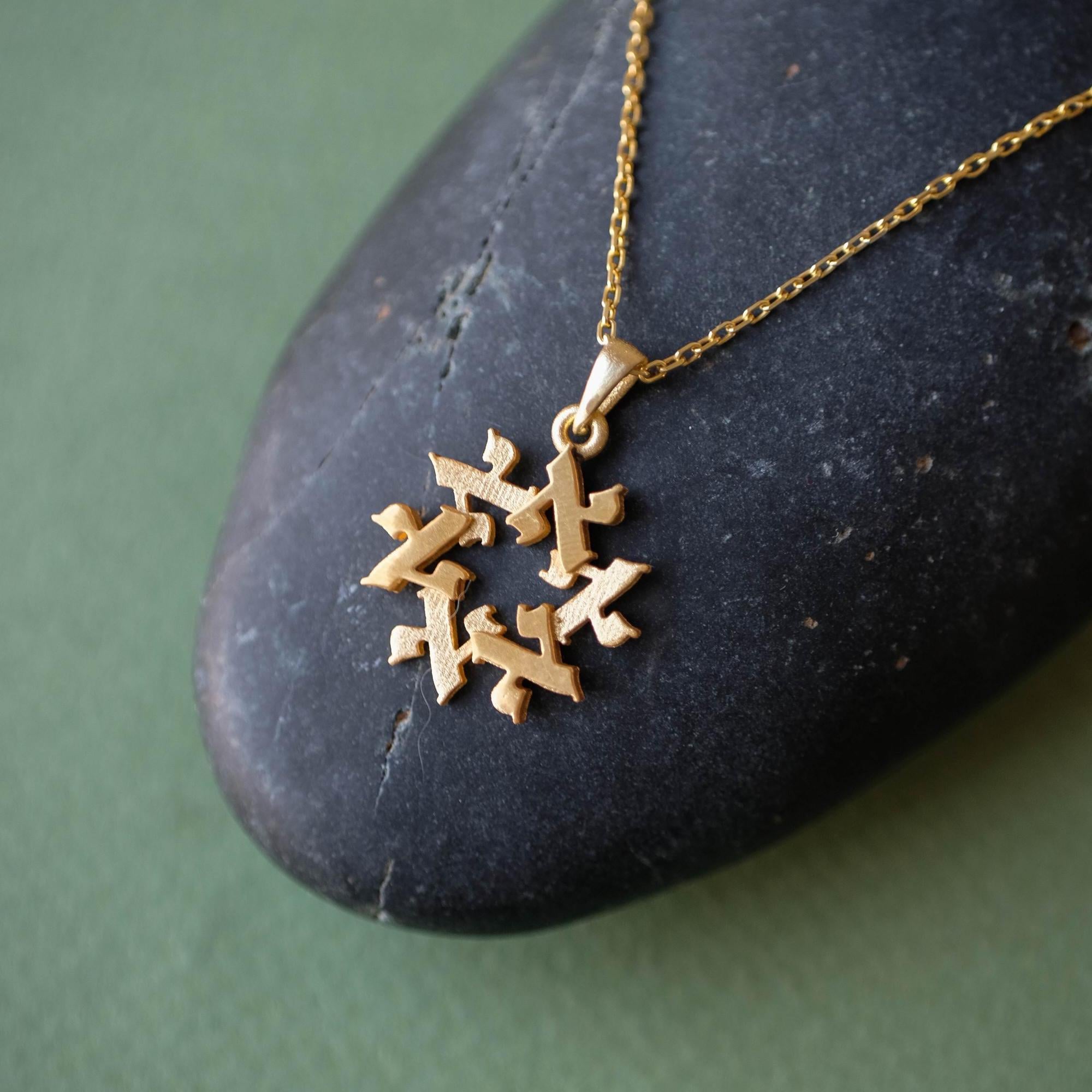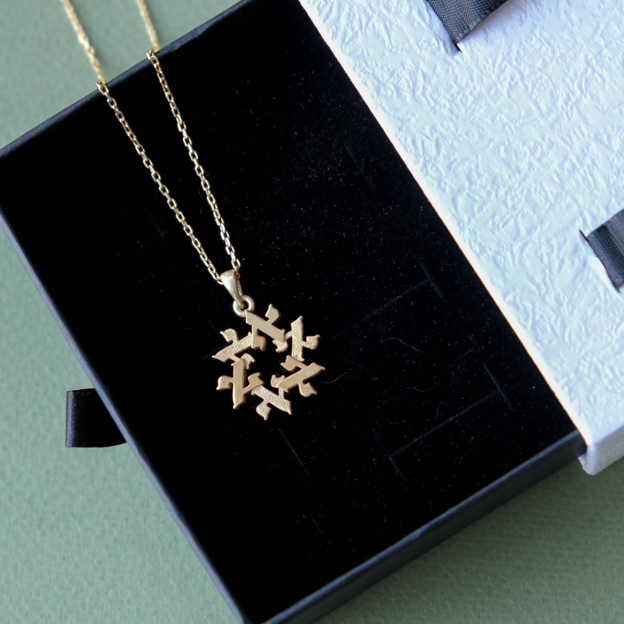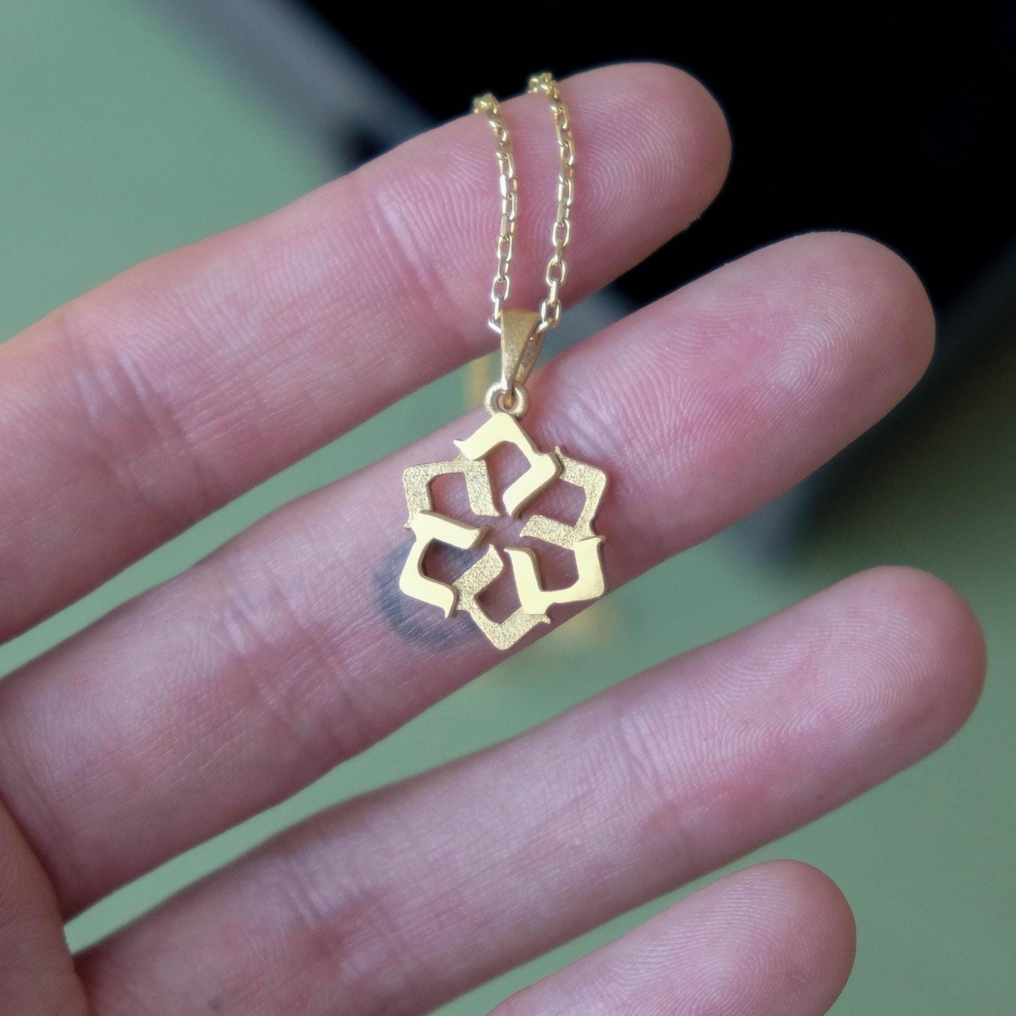 A meaningful 14k gold Star of David pendant formed from six Hebrew letters arranged in a circle.