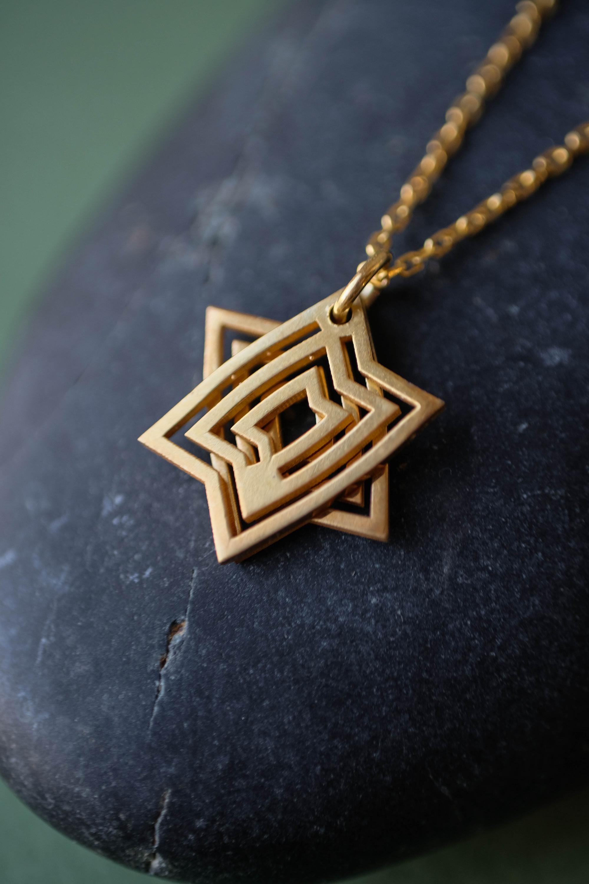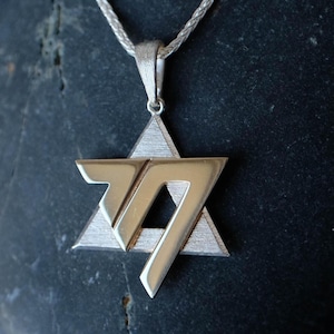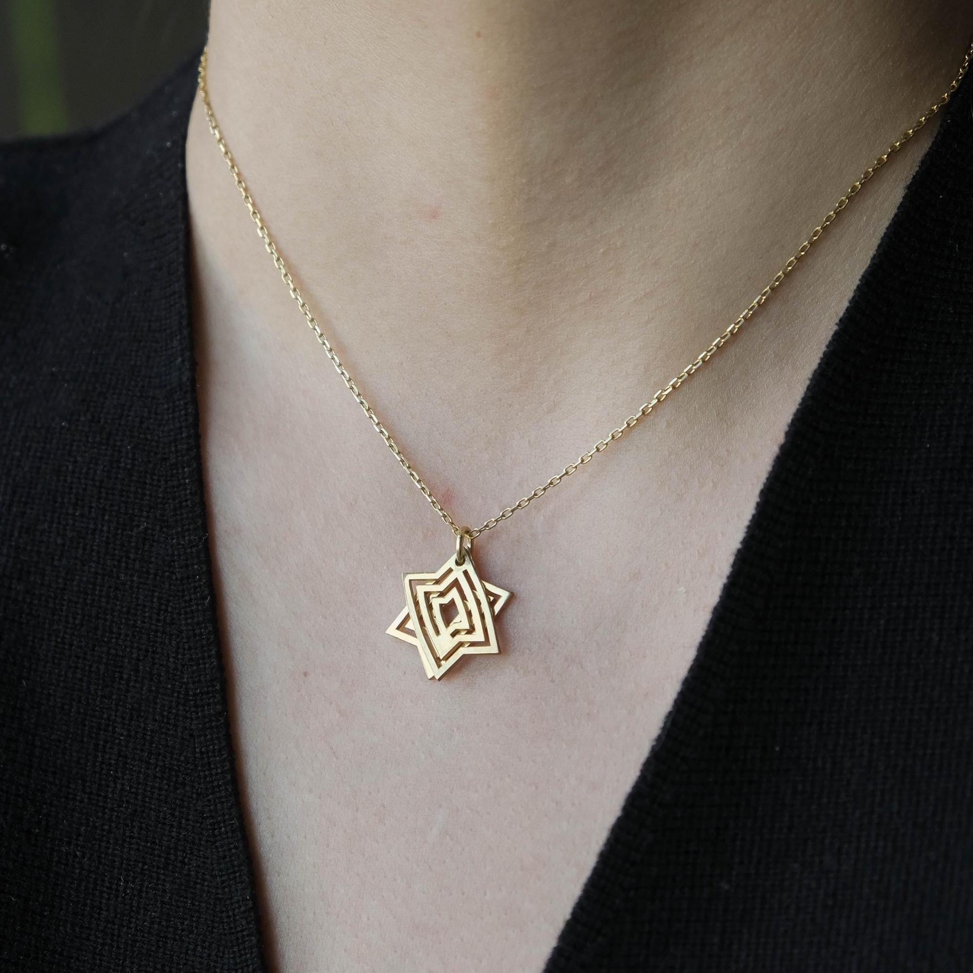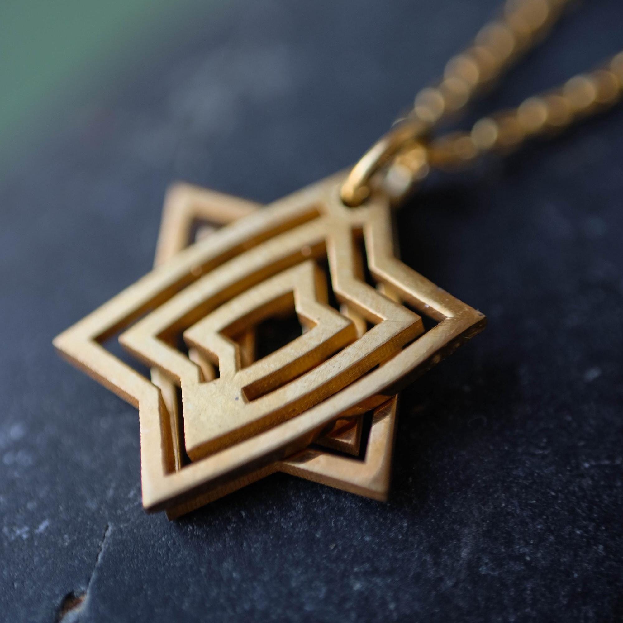 The pendant is made from two geometric elements that sit together to form the Star of David shape. Because it’s a moving, interactive design, the pieces can subtly shift as you wear it and can be gently slid and rotated in your fingers—a calming kind of tactile / fidget jewelry many people love for focus.