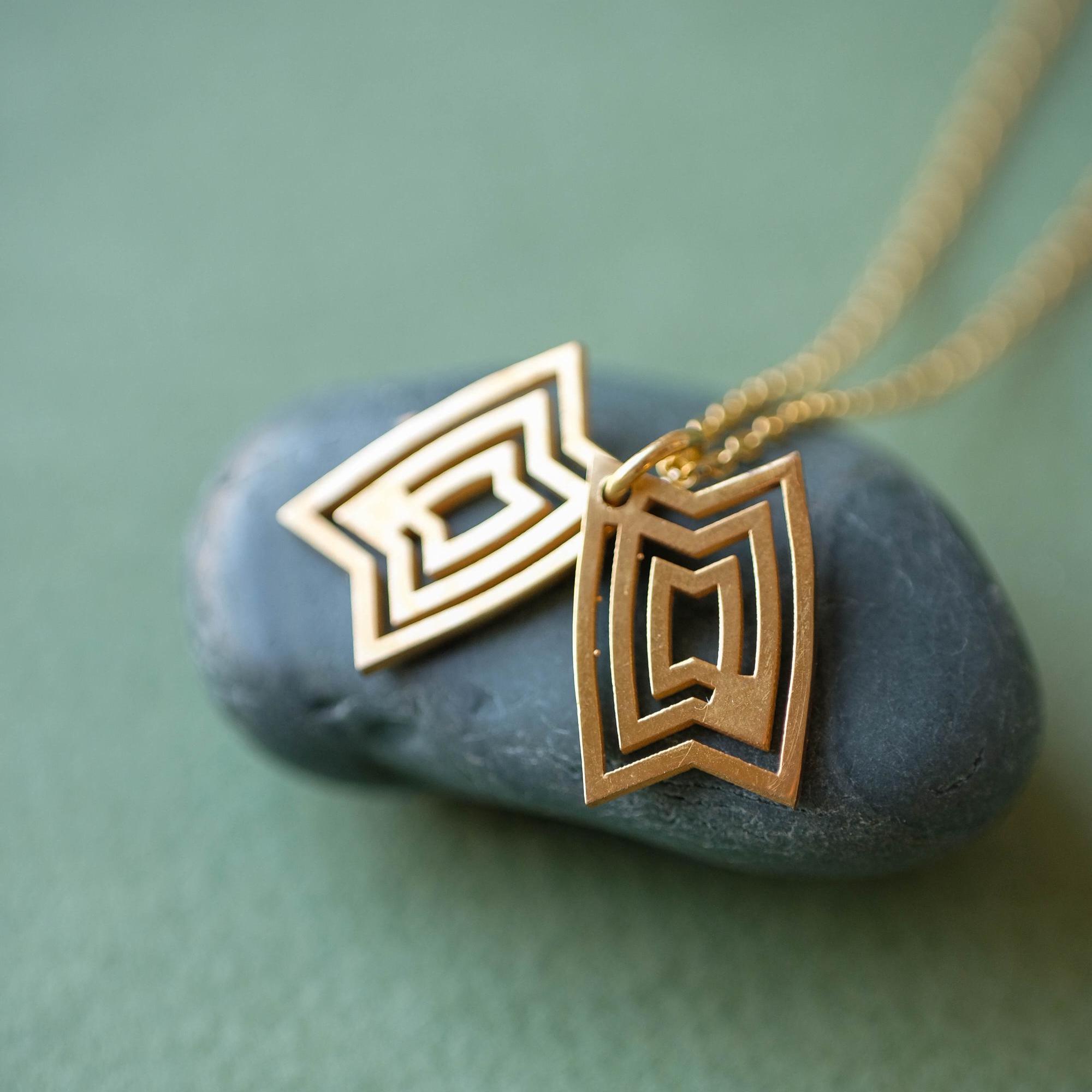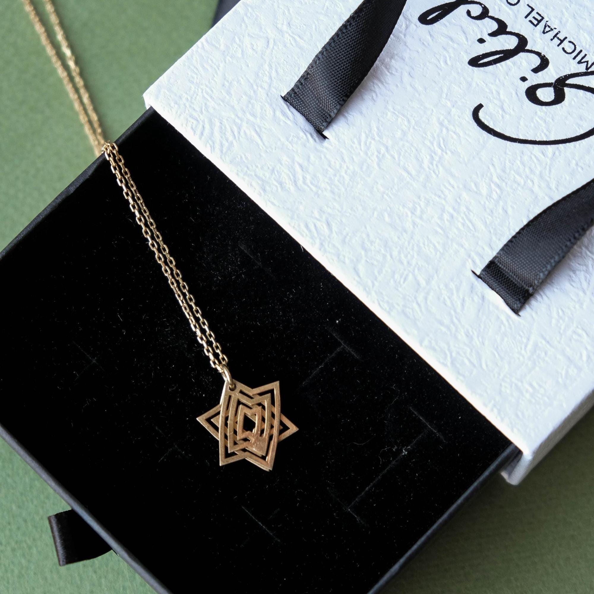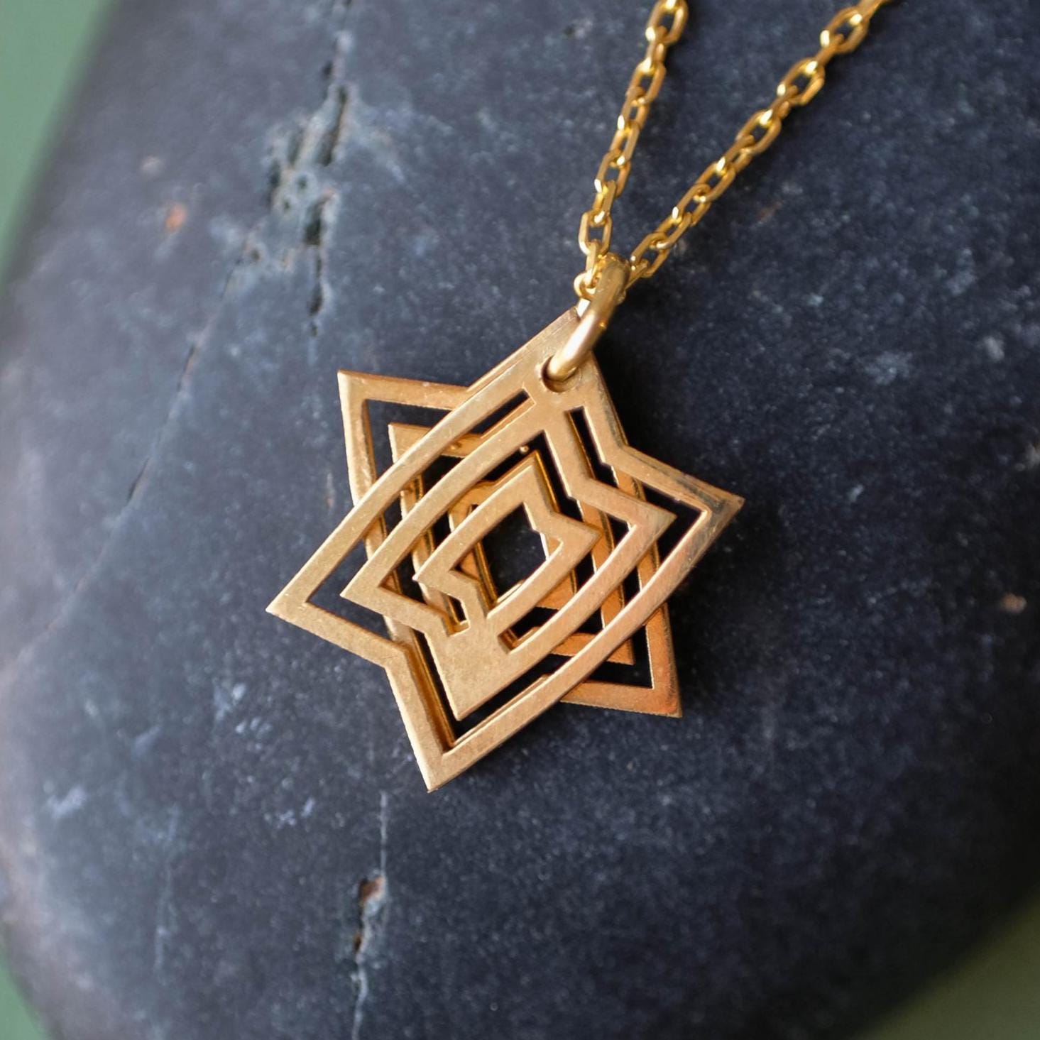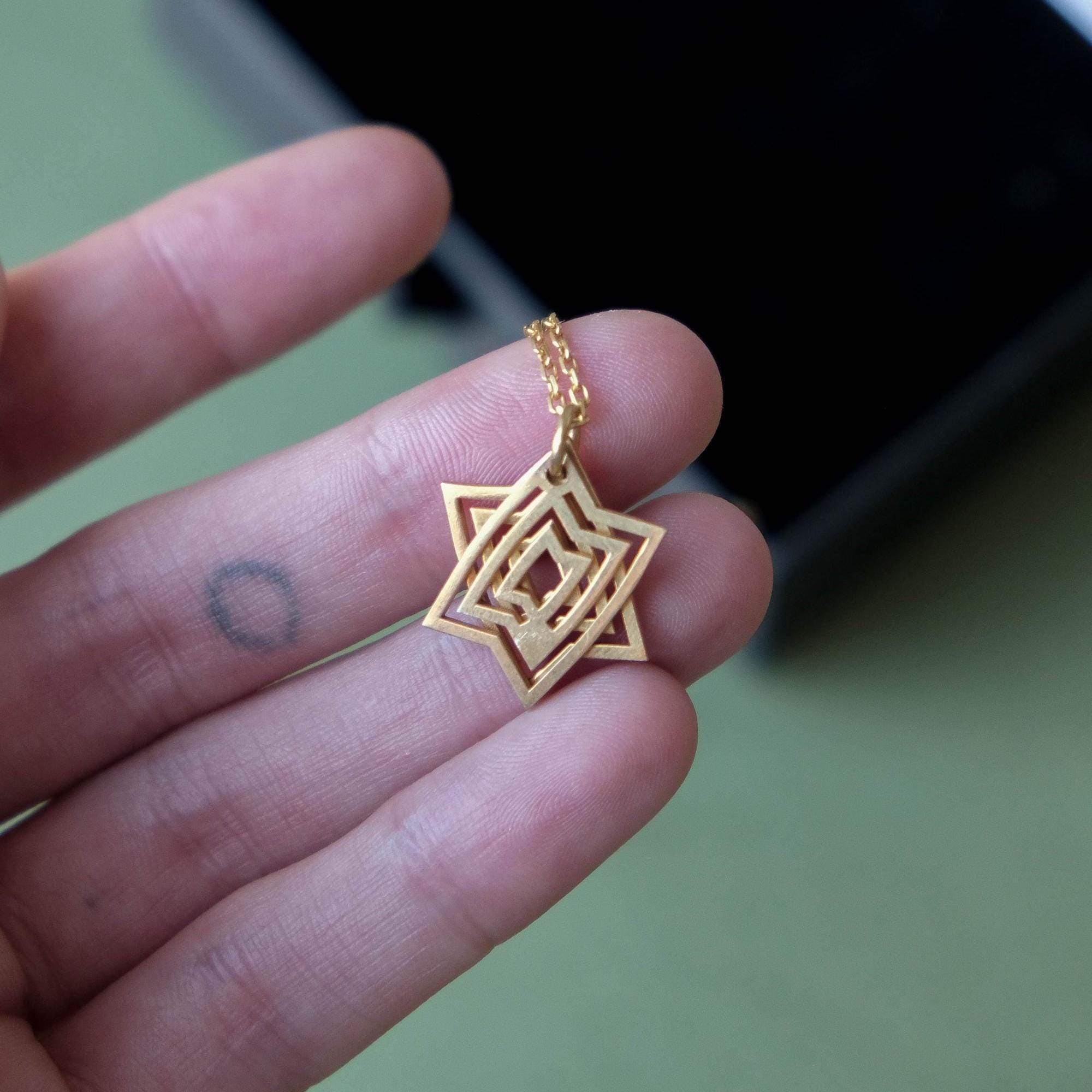 The pendant is made from two geometric elements that sit together to form the Star of David shape. Because it’s a moving, interactive design, the pieces can subtly shift as you wear it and can be gently slid and rotated in your fingers—a calming kind of tactile / fidget jewelry many people love for focus.